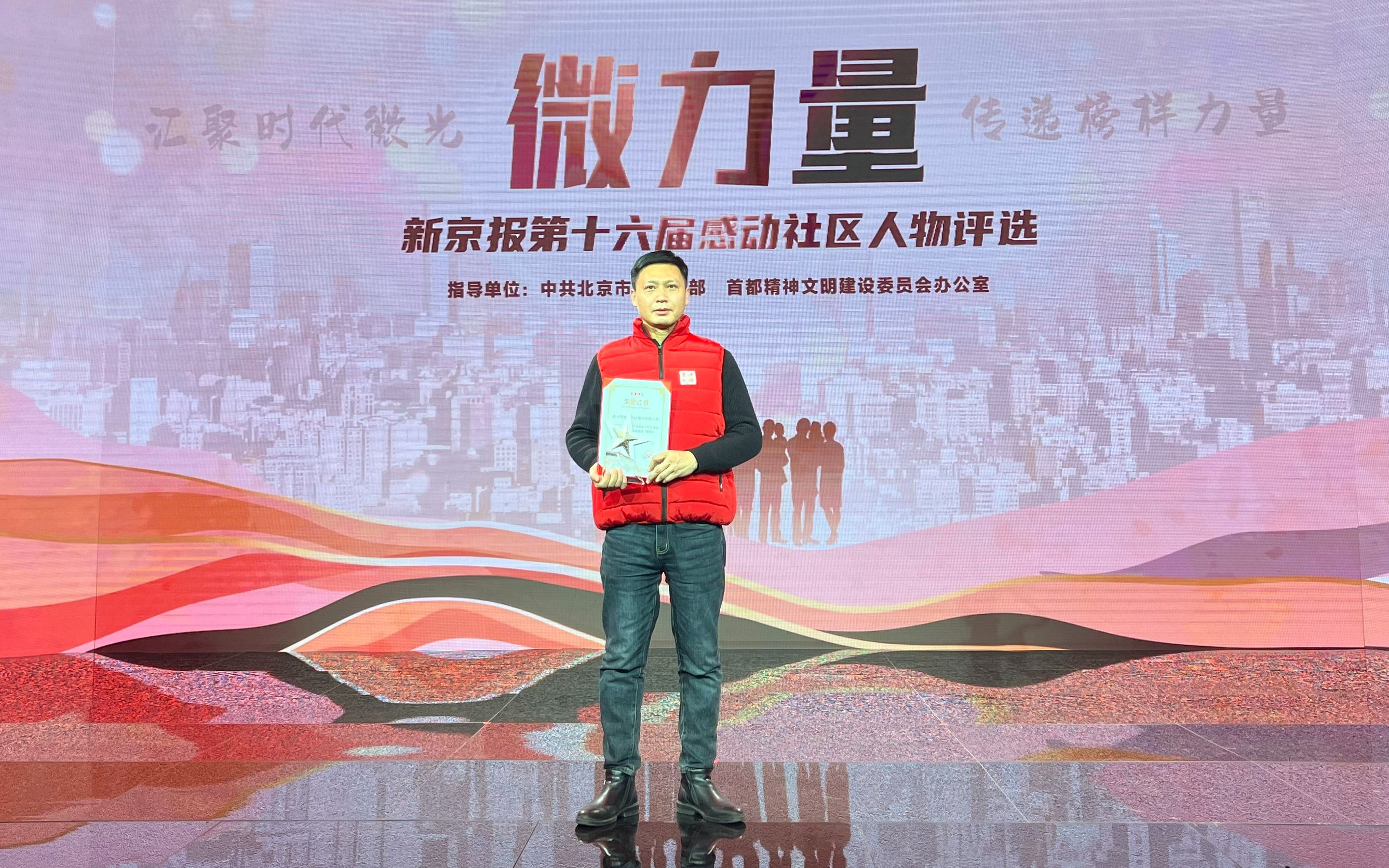 1月13日,在“微力量——新京报第十六届感动社区人物评选”颁奖典礼,朝阳区南磨房街道美景东方社区书记张松涛特意穿上了社区工作红色马甲。