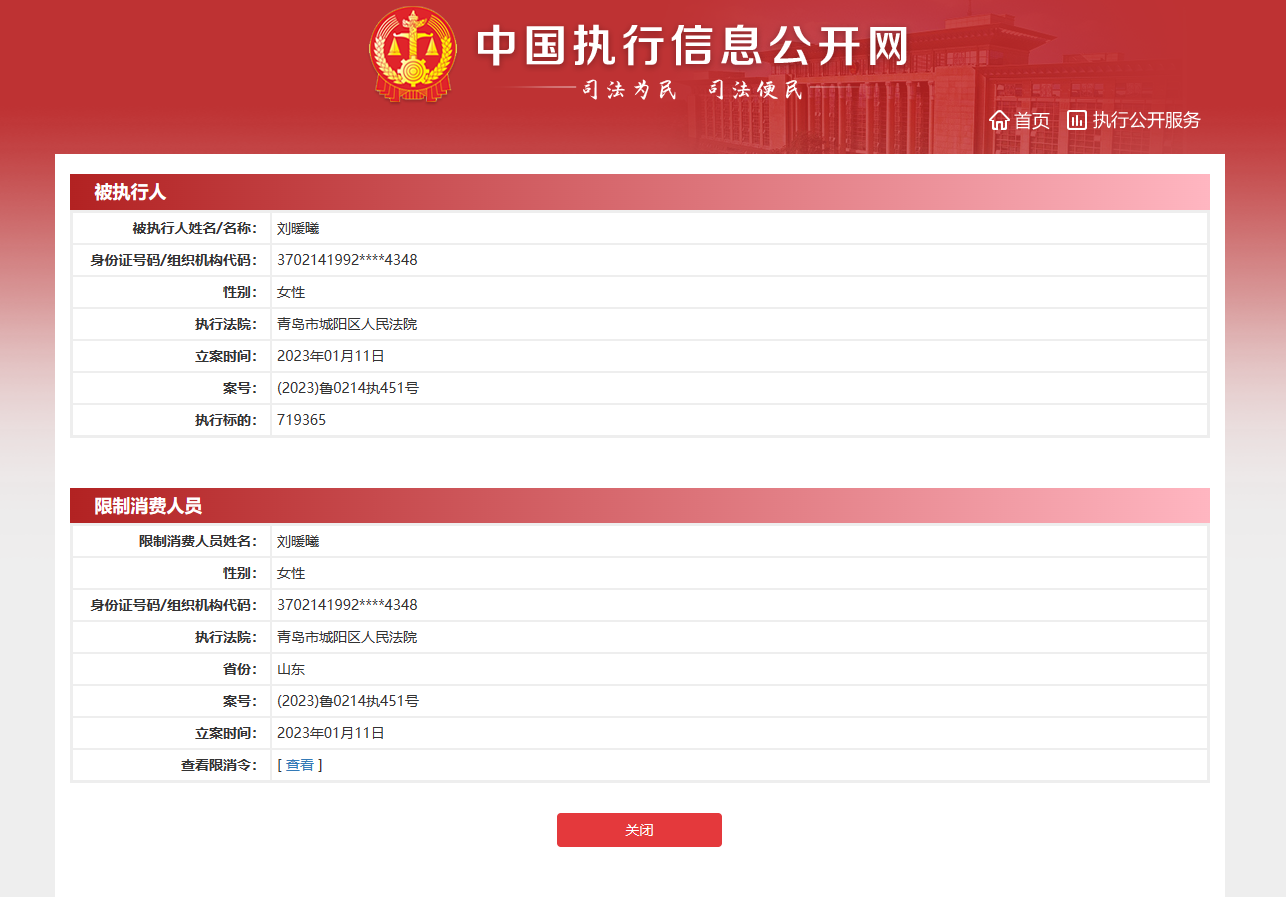 新京报讯 据中国执行信息公开网显示,1月16日,青岛市城阳区人民法院向刘暖曦(原名刘鑫)发布限制消费令,对其采取限制消费措施。详情如下: