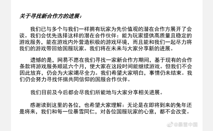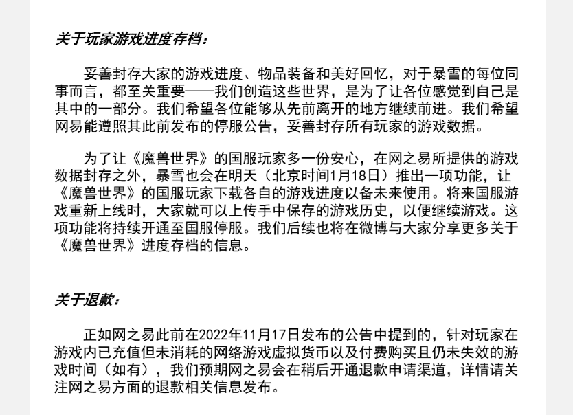 1月17日,暴雪官方发布公告表示,遵照网之易停服公告于1月23日中止国服游戏服务。我们希望网易能遵照此前其发布的停服公告,妥善封存所有玩家的游戏数据;我们预期网之易会在稍后开通退款申请渠道。