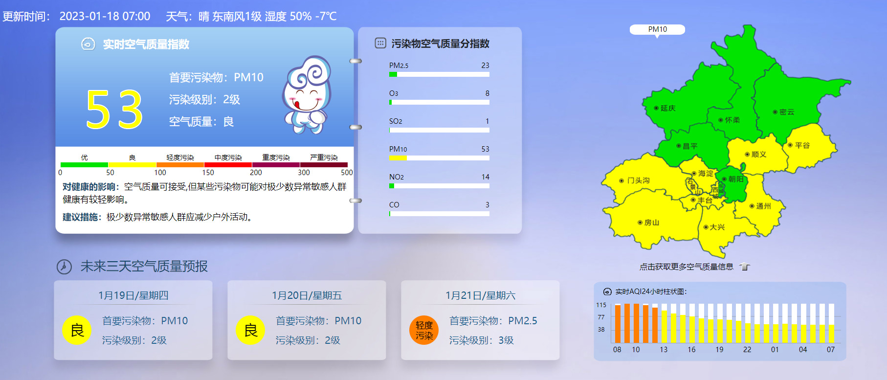 据北京市生态环境监测中心今早7时数据,目前实时空气质量指数53,首要污染物PM10,污染级别2级,空气质量良。