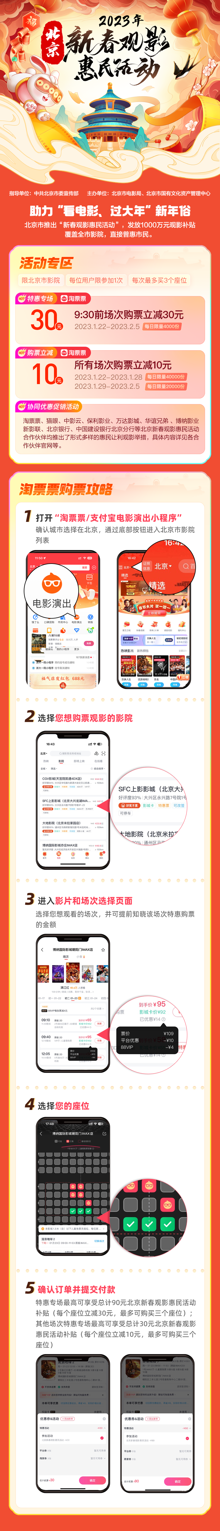2023年春节档期间,《流浪地球2》《无名》《满江红》《交换人生》《深海》《中国乒乓》《熊出没•伴我“熊芯”》等国产优秀影片纷纷上映。活动期间,广大市民可通过淘票票APP参与到形式多样的惠民让利观影举措,一是通过抢票方式开展特惠专场,市民可享受购买北京市影院9:30前的电影场次时立减30元,每天限量4000份;二是联合立减,春节期间全市所有时间段覆盖北京市所有影院所有影片,开展全日立减10元活动,每个订单最多可购票3张。其中,1月22日(正月初一)至1月28日(正月初七)每日限量40000张,1月29日(正月初八)至2月5日(正月十五)每日限量20000张;三是各票务平台、金融机构及各大院线等合作伙伴将推出形式多样的惠民让利观影举措,例如万达国际电影城推出的“放价迎新春”学生专享2D/3D特惠观影券发放活动、北京银行推出的“非常假期”9元观影活动等。