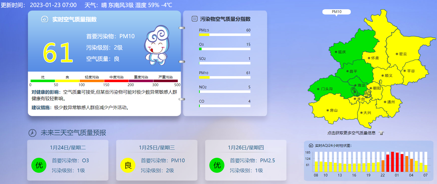 据北京市生态环境监测中心今早7时数据,目前实时空气质量指数61,主要污染物PM10,污染级别2级,空气质量良。