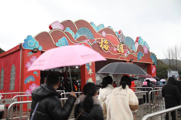 梅园景区内悬挂着红灯笼,浓浓的节日氛围。
