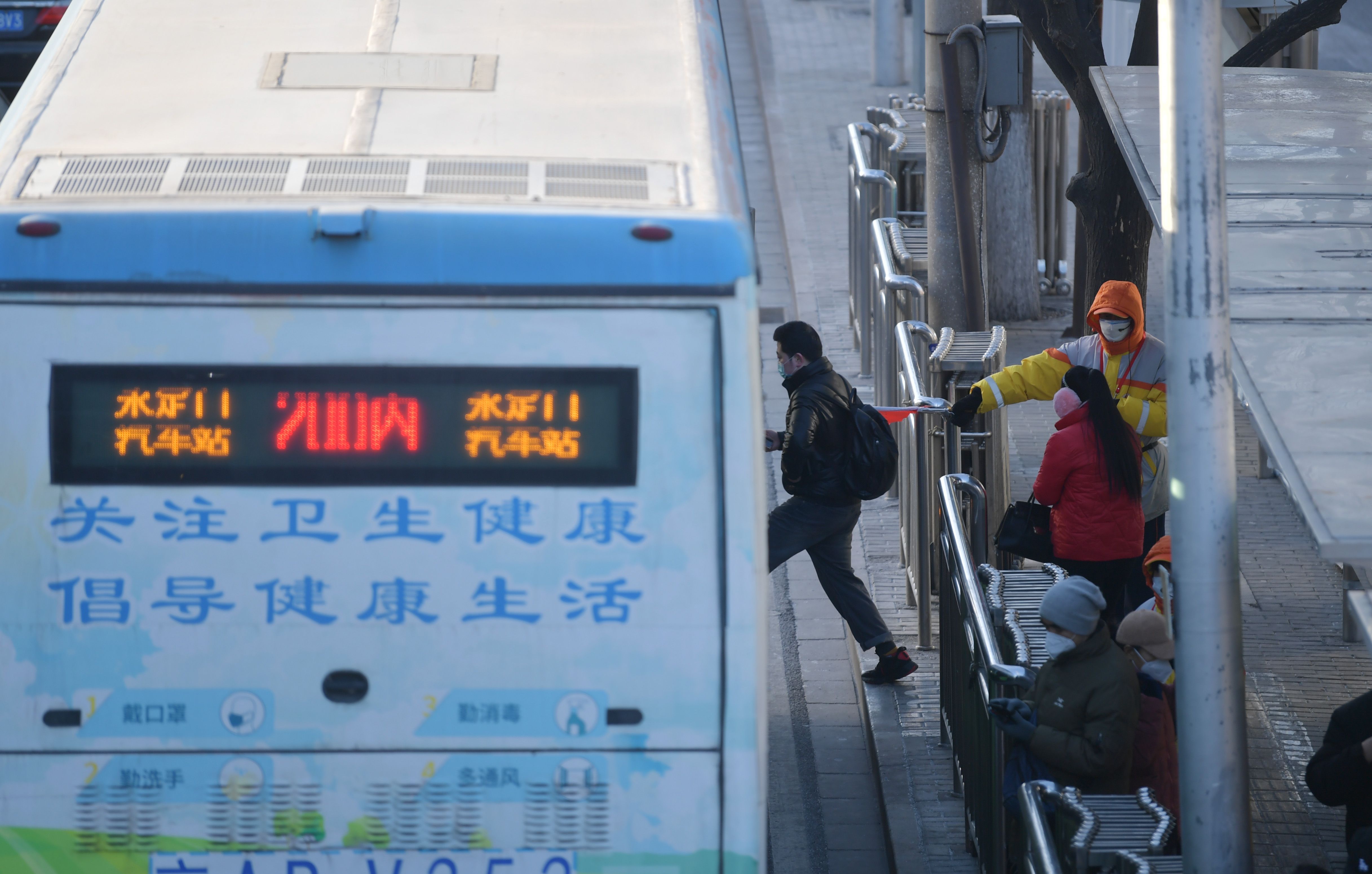 乘客正跨上一辆公交车。新京报记者 李木易 摄