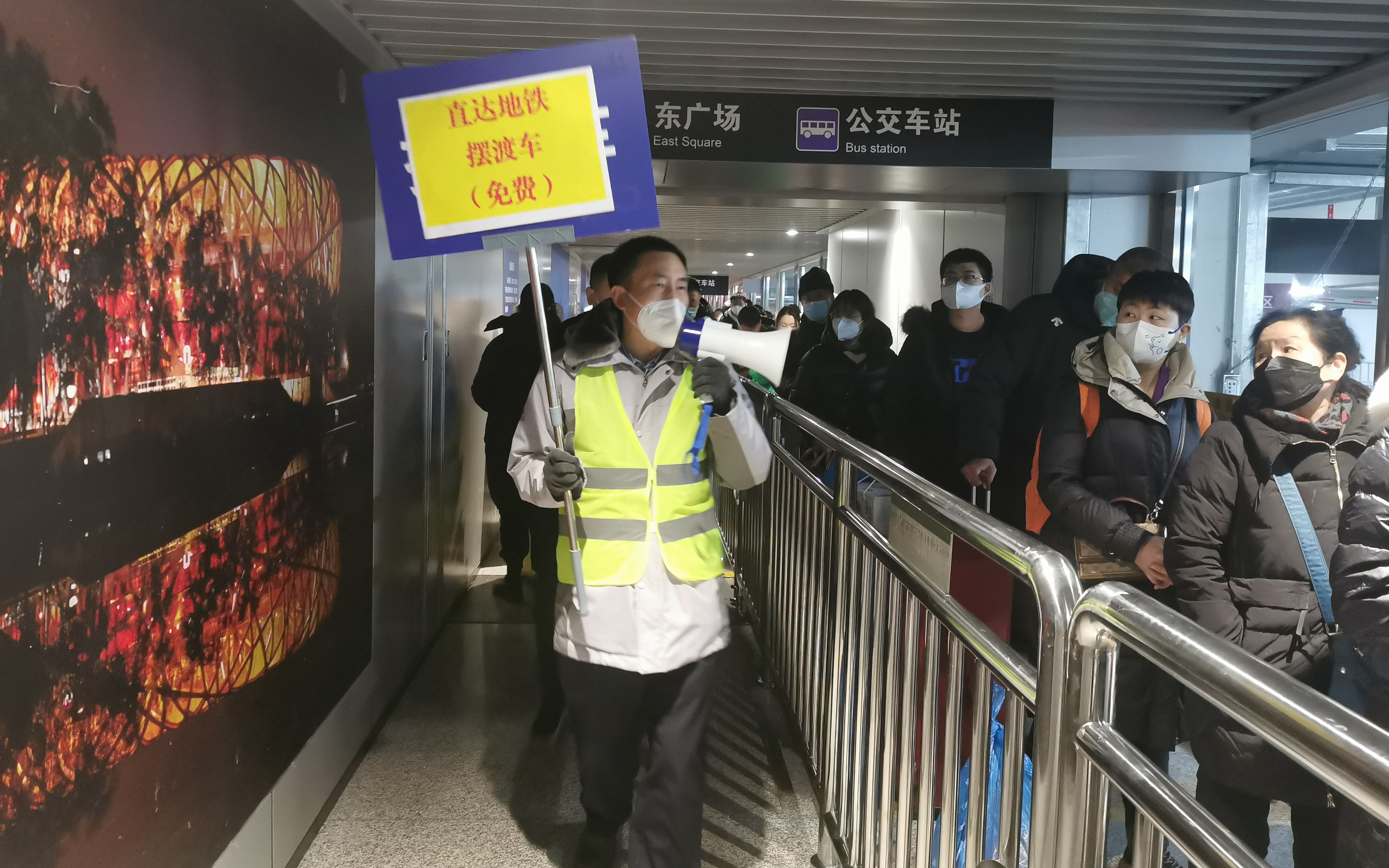 在北京西站地区的一处出租车调度站内,工作人员引导旅客乘坐免费摆渡车。北京西站地区管理办公室供图