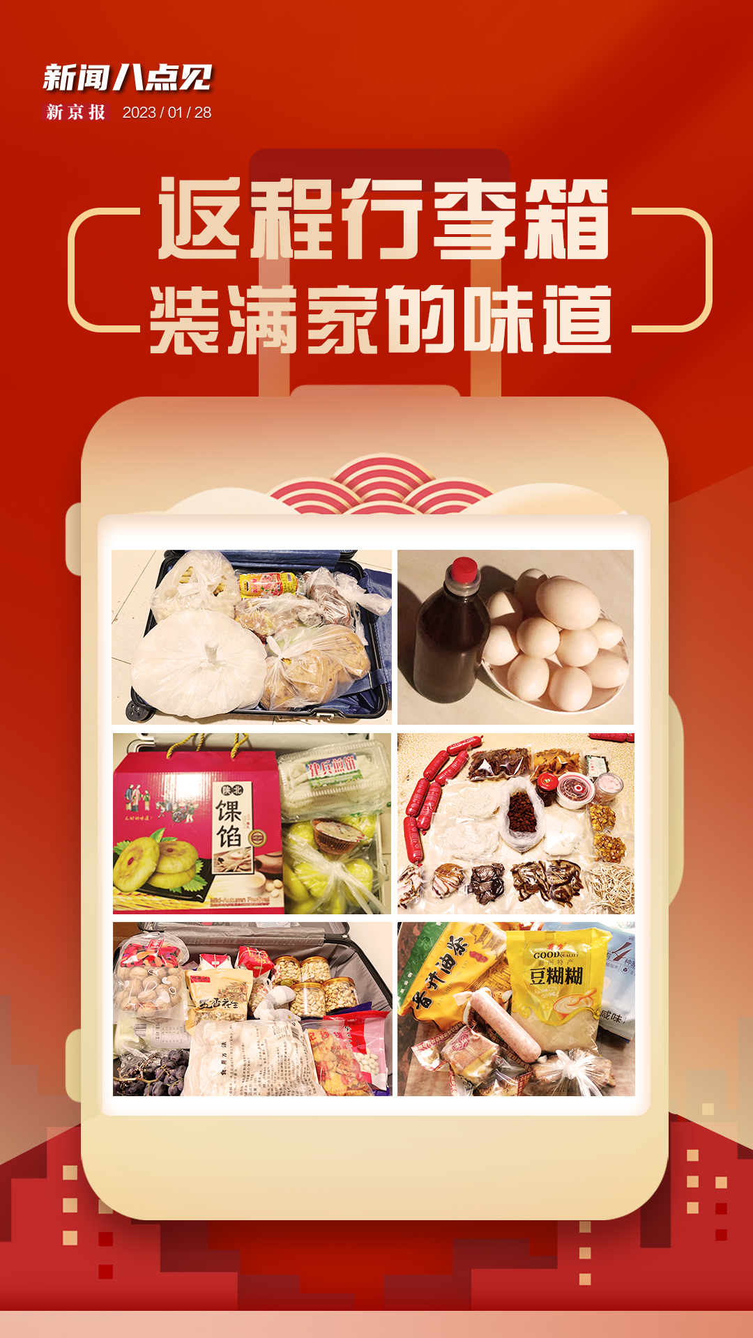 春节假期结束,返程的人们带回了满满当当的行李箱,里面装着的是美食,也是家的味道。
