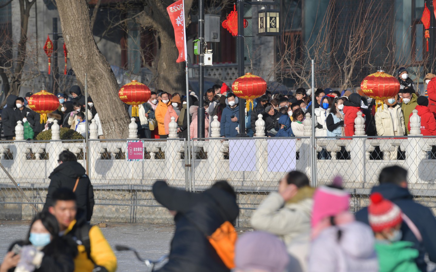 1月25日,北京什刹海冰场,等待进入冰场的游客排起长龙。新京报记者 李木易 摄
