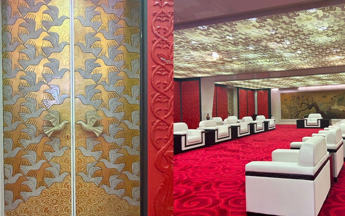 祥云金厅是各大赛事重要来宾的休息室及会客场所,地毯为祥云图案,墙壁及顶部图案均为和平鸽,共有2008只鸽子,象征着北京2008年奥运会。大厅的门把手是一对和平鸽的造型,由鸡蛋壳跟子弹壳制作而成,象征着世界永远和平。