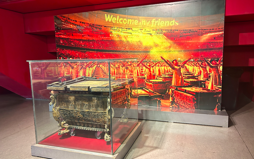 在场馆内部,还有各种“中国式浪漫”彩蛋,等待玩家发现。比如,金色通道四周墙壁上的陶瓷马赛克一共有56种,象征着56个民族。通道上方的灯看上去像一个个倒扣着的小鸟巢。