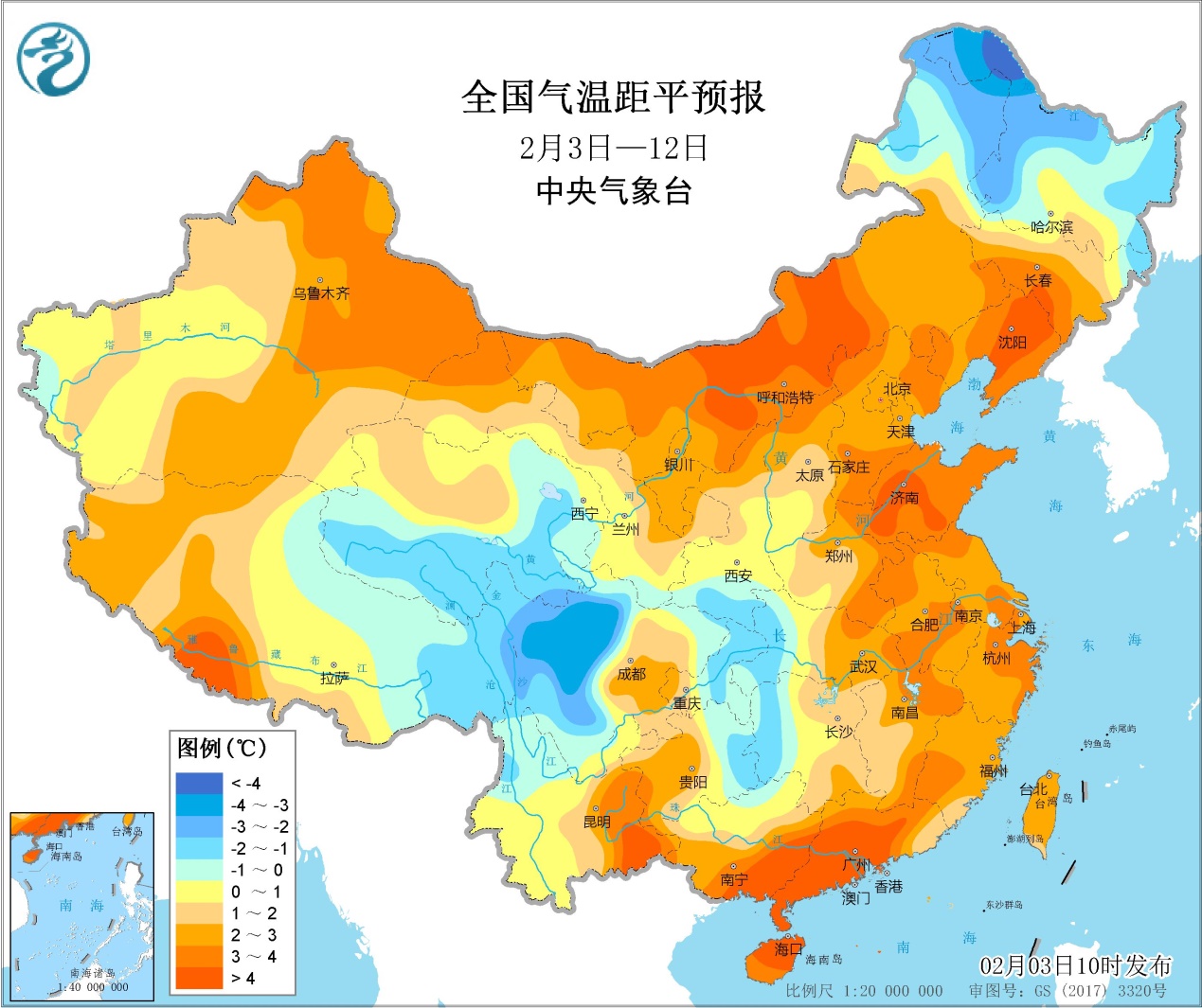 未来10天,影响我国的冷空气势力较弱,中东部大部地区的气温较常年平均偏高1~4℃,西藏东部、青海南部、川西高原、黑龙江北部等地气温偏低1~3℃。