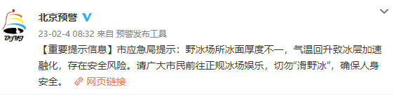 北京市应急局:气温回升致冰层加速融化,切勿“滑野冰”