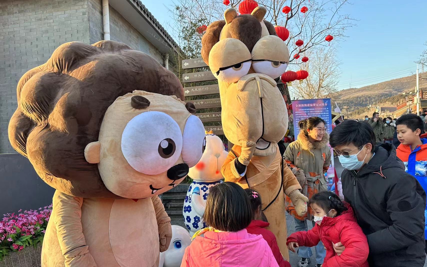 游客与模式口大街的吉祥物打招呼。新京报记者 王巍 摄