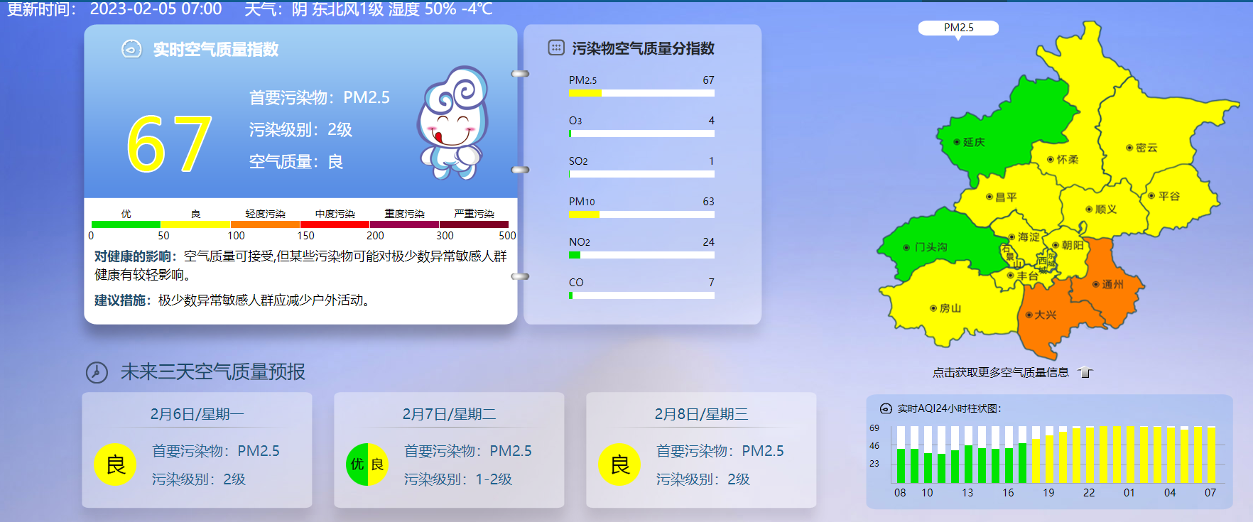 据北京市生态环境监测中心今早7时数据,目前实时空气质量指数67,首要污染物PM2.5,污染级别2级,空气质量良。