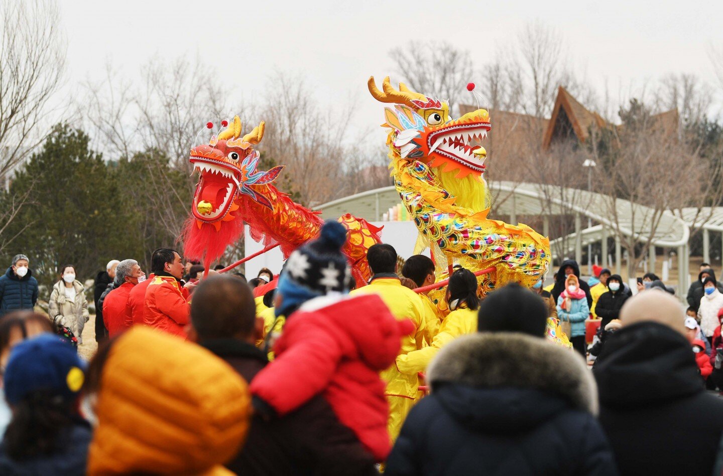 2月5日,延庆世园公园的元宵节花会游园活动上,现场舞龙表演吸引众多游客观看。新京报记者 陶冉 摄