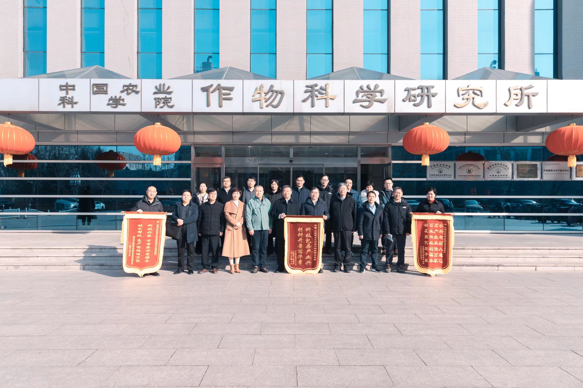2月5日,内蒙古开鲁县政府工作人员和种植大户到中国农科院作科所座谈科技包县工作,分别向作科所和李少昆团队赠送锦旗。中国农科院供图