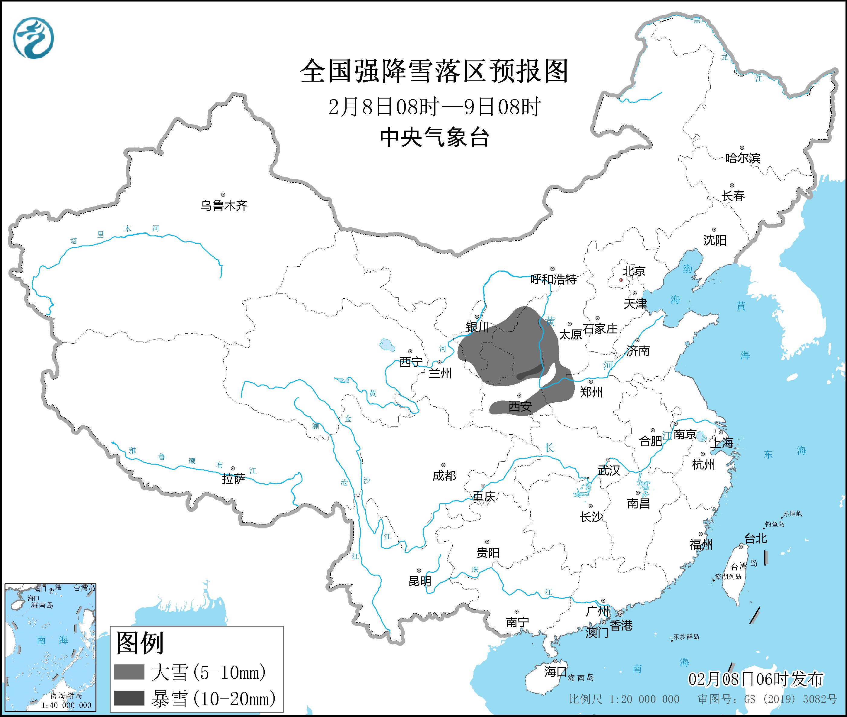 预计2月8日08时至2月9日08时,内蒙古河套地区、甘肃东部、宁夏大部、陕西北部和秦岭山区、山西西南部、河南西部等地部分地区有大雪,其中,陕西中北部局地有暴雪。上述部分地区新增积雪深度4~8厘米,局地可达10厘米以上。