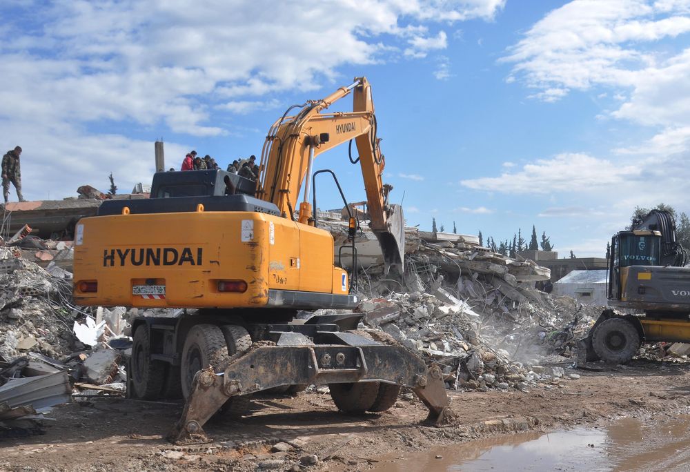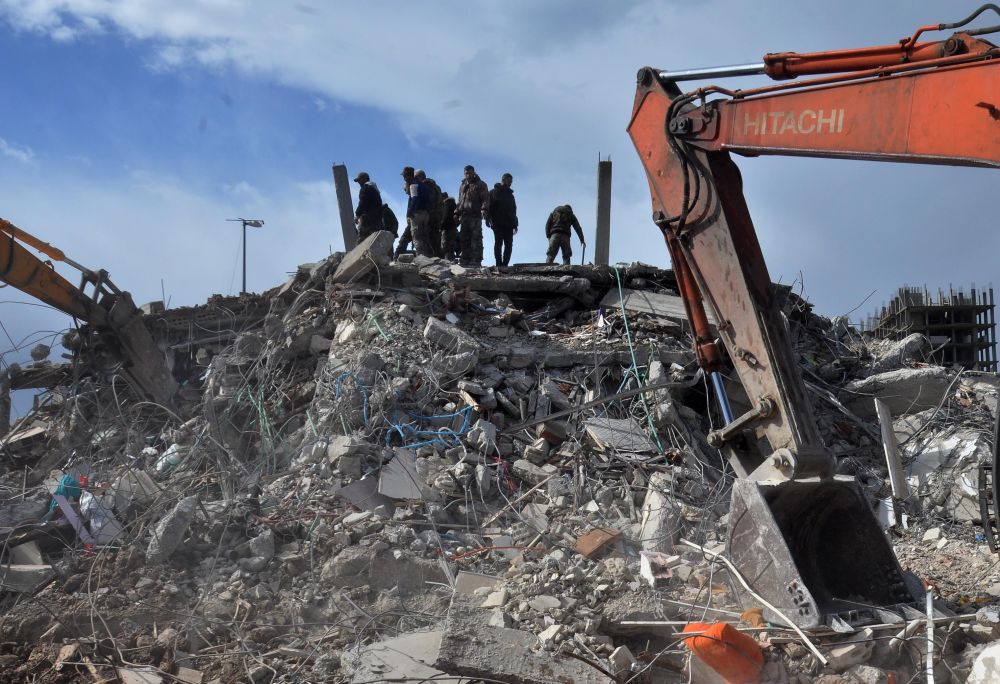 2月7日,人们在叙利亚拉塔基亚省的一处地震废墟参与搜救。新华社发