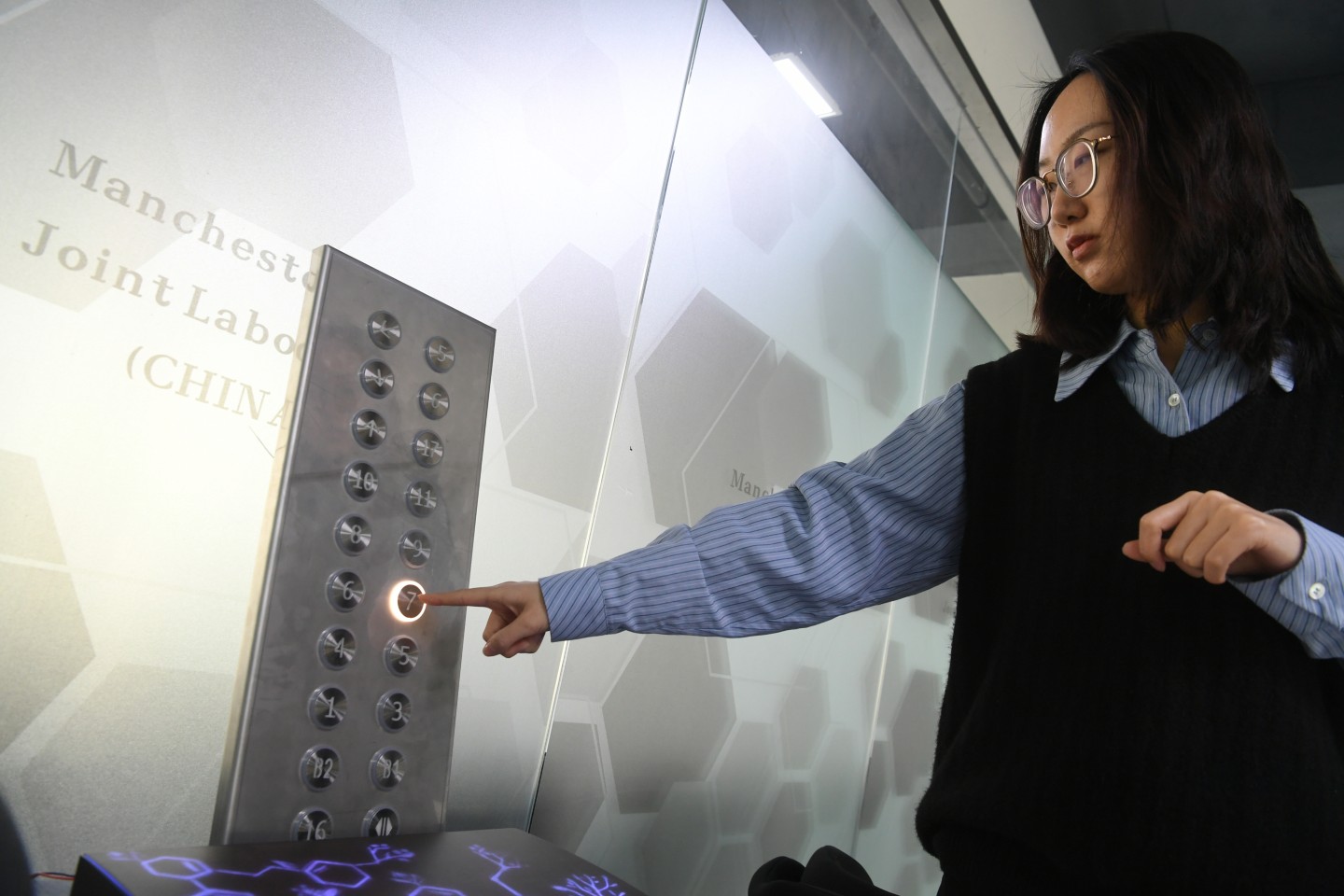 他山科技公司工作人员展示感触式电梯按钮。新京报记者 王颖 摄