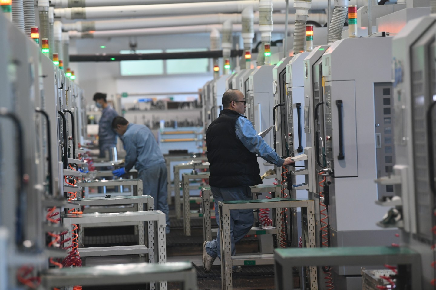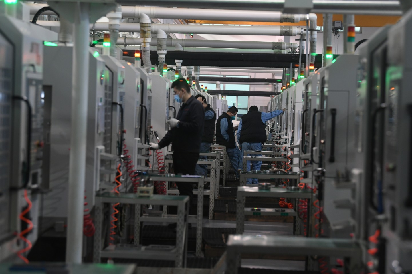 记者在车间看到,10多位工人,正在一排排机器之间紧张地工作,随着工人按动相应的启动键,闪烁着绿灯的机器便开始工作,大块的金属材料被送进机器,工人一键启动后,闪烁着绿灯的设备便开始工作,程序是提前编制好的,中间不需要人工的干预,当绿灯熄灭,一个个精密的零件就加工好了。
