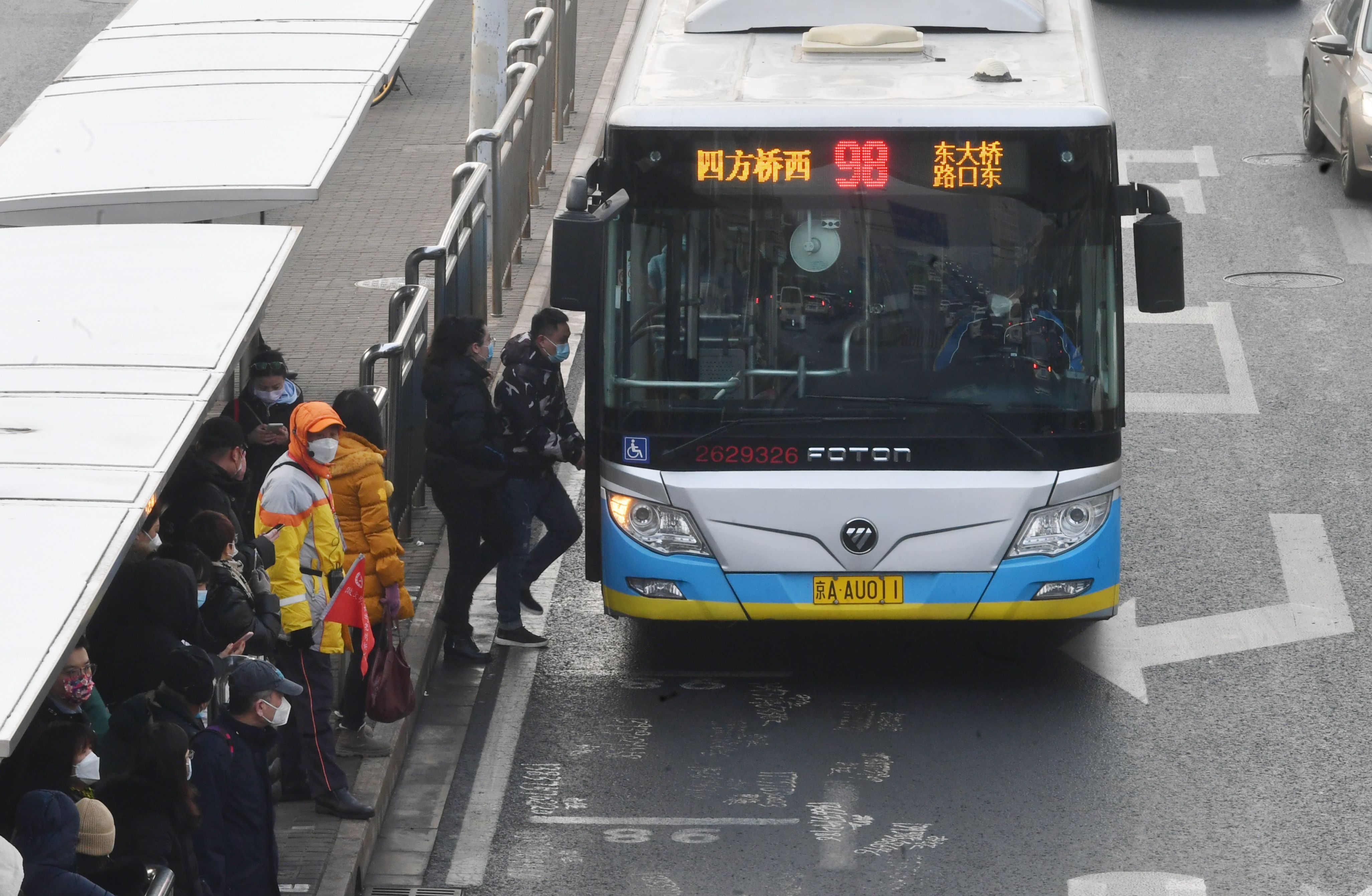 2月10日,东三环双井桥附近,市民排队乘坐公交车。 新京报记者 王贵彬 摄