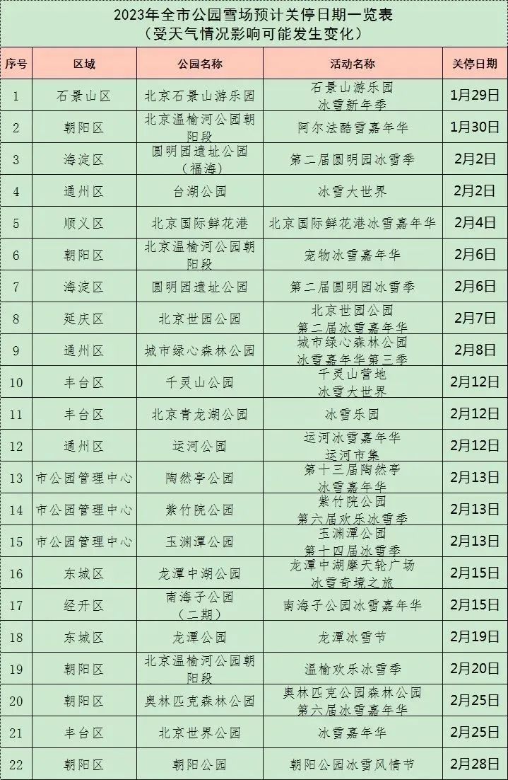 爱玩雪的游客也不要着急,按照“全市公园雪场关停日期一览表”,仍有一些冰雪季活动预计开放至2月下旬,比如北京温榆河公园朝阳段的温榆欢乐冰雪季将持续至2月20日,北京奥林匹克森林公园第六届冰雪嘉年华预计持续至2月25日,北京世界公园冰雪嘉年华预计持续至2月25日。