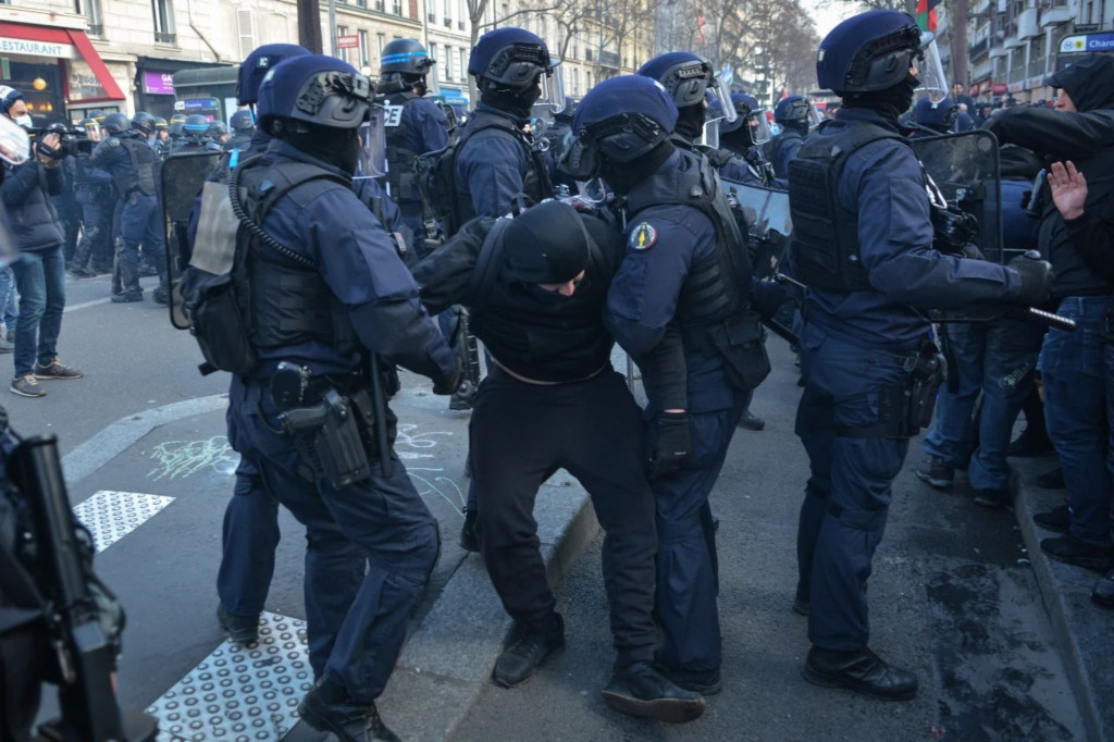 当地时间2023年2月11日,法国巴黎,在一场反对马克龙退休制度改革的罢工游行中,有民众与防暴警察发生了冲突。图/视觉中国