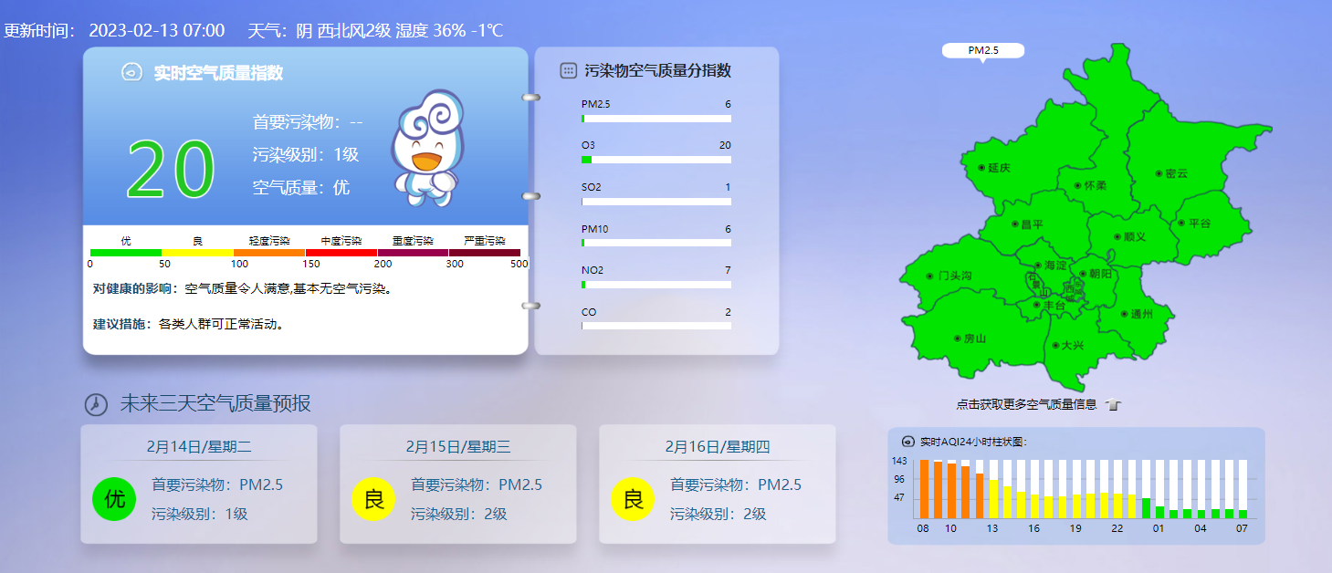 据北京市生态环境监测中心今早7时数据,目前实时空气质量指数20,空气质量优。
