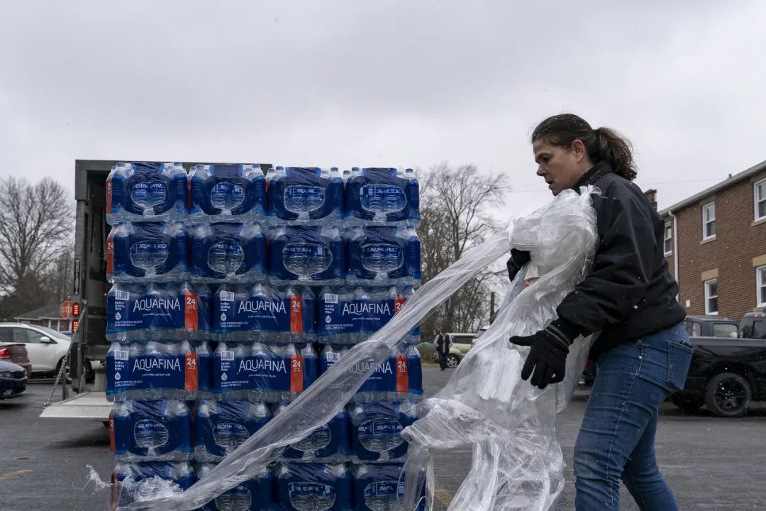 当地时间2023年2月17日,美国俄亥俄州东巴勒斯坦,志愿者向居民分发瓶装水。图/视觉中国