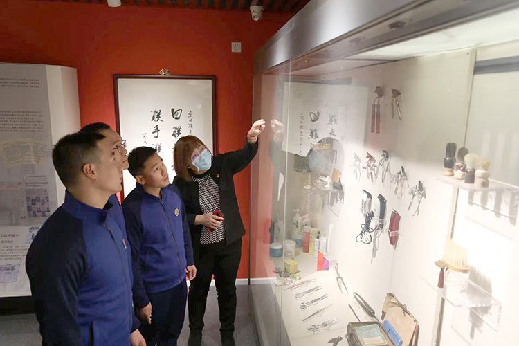 四联美发博物馆,工作人员向顾客讲解四联美发的历史。