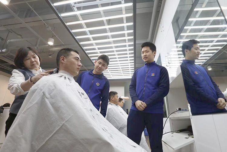 四联美发前门店里,理发师傅为前门大街消防指战员进行义务理发。