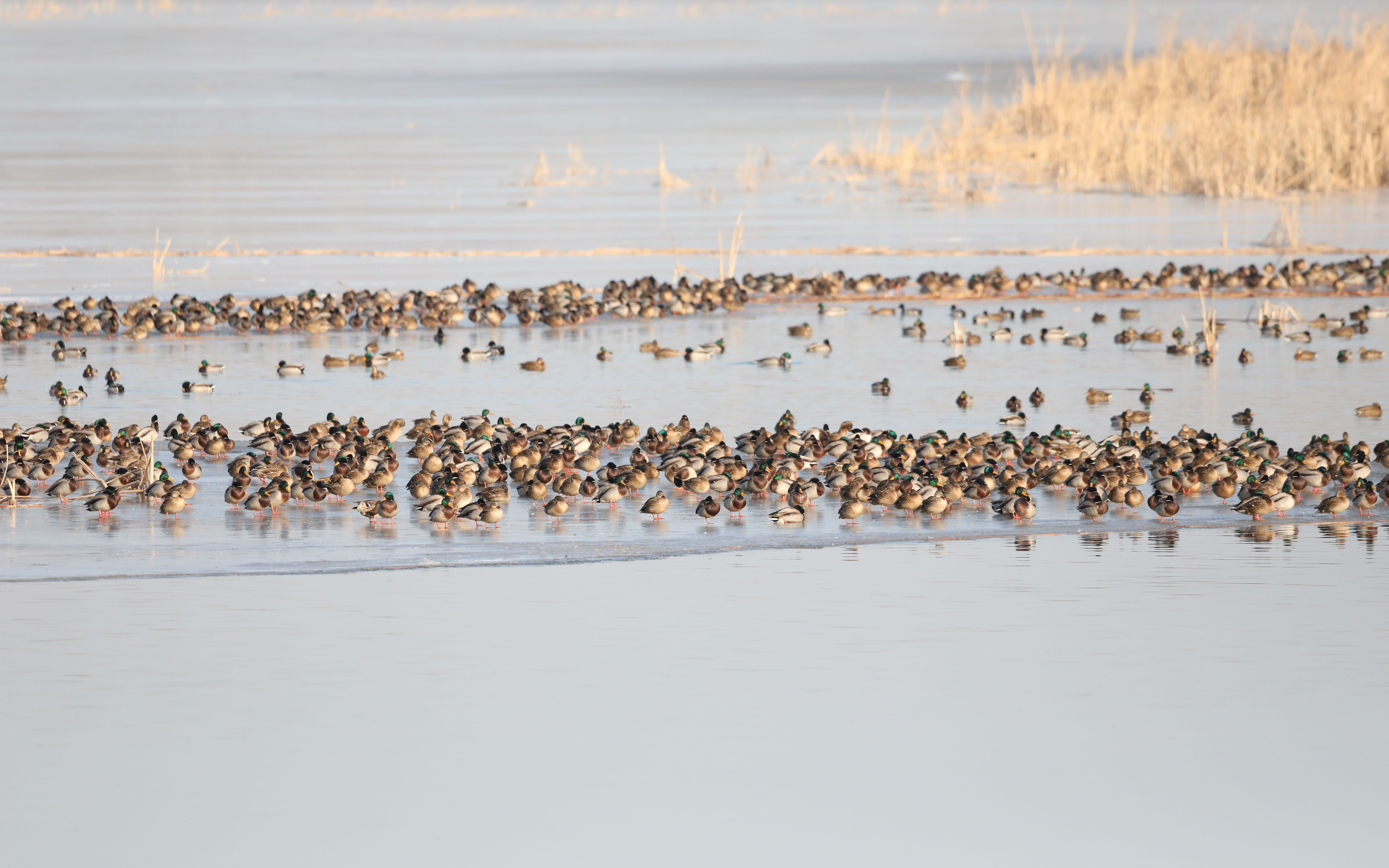 经监测发现,自从2020年保护区种植鸟类“食源地”以来,每年冬季来野鸭湖越冬的鸟类数量和种类明显增加,越冬迁徙高峰期单日监测各种鸟类数量更是达上万只,充足的食物为野生鸟类越冬提供了有效的保障。往年食源地监测到灰鹤、豆雁最多,今年由于鸟类食源地食物丰富,不仅有大群的灰鹤和豆雁栖息于此,还吸引了附近水域的大批绿头鸭前来觅食。