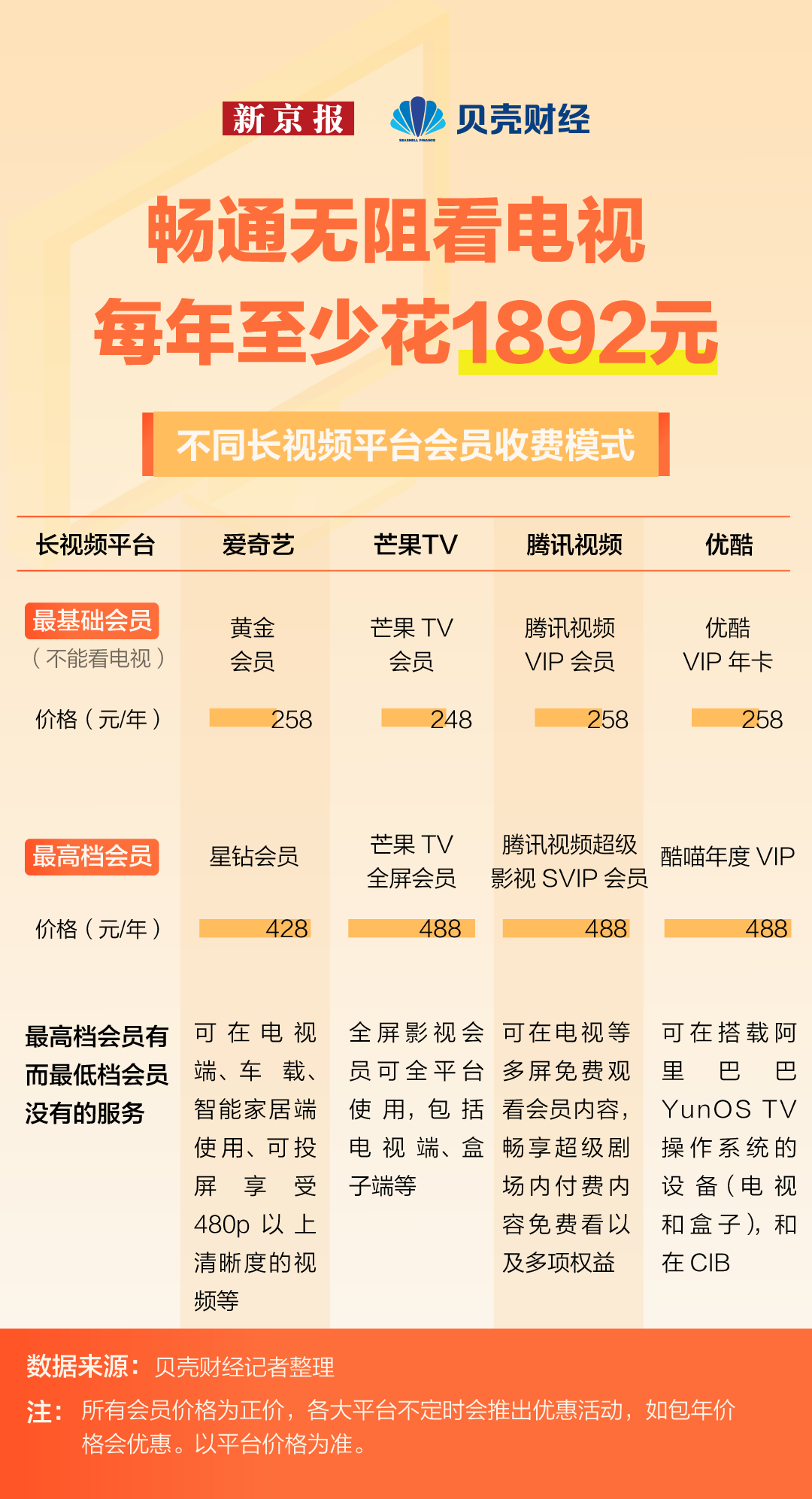 贝壳财经记者梳理主流长视频平台会员收费模式发现,这些长视频平台上的基础版会员,基本都不支持在电视端播放。如果想要畅通无阻在电视上观看所有节目,每年最少需要花费1892元购买主流长视频平台上的最高配置的会员,其中还不包括有线电视费、宽带费以及部分应版权方要求的付费电影等。