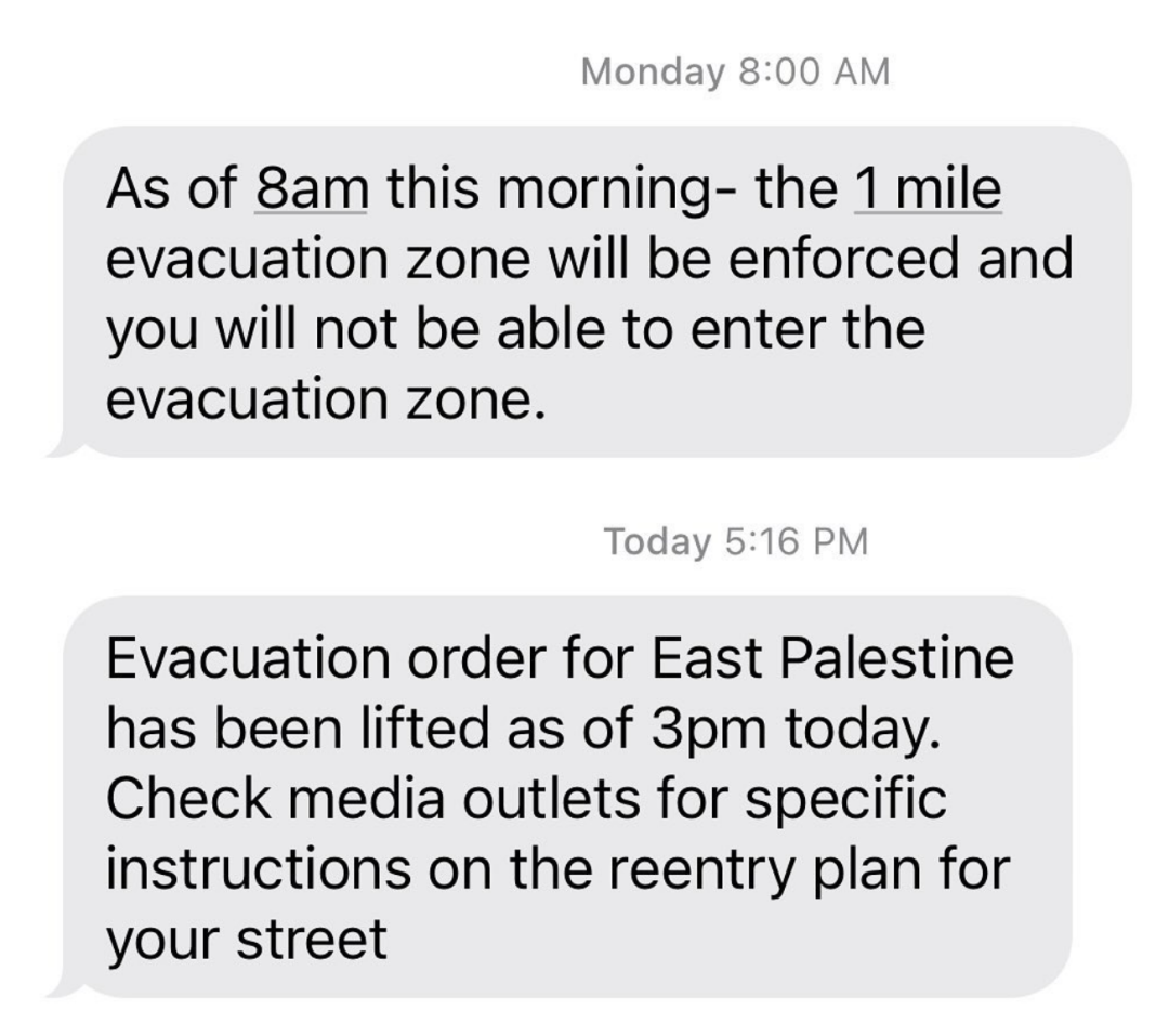 埃尔泽也收到了要求撤离的短信,她的住所距离事故发生地只有三分之一英里。埃尔泽和丈夫先在自家当地的温室中凑合了一晚,然后开车到匹兹堡住了两天。当地时间2月8日,美国环境保护署(EPA)的数据显示,当地水质量和空气质量都恢复到正常水平,疏散命令被正式解除。