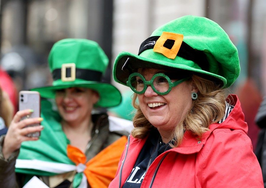 2022年3月13日,人们在英国伦敦观看圣帕特里克节游行。新华社记者李颖摄