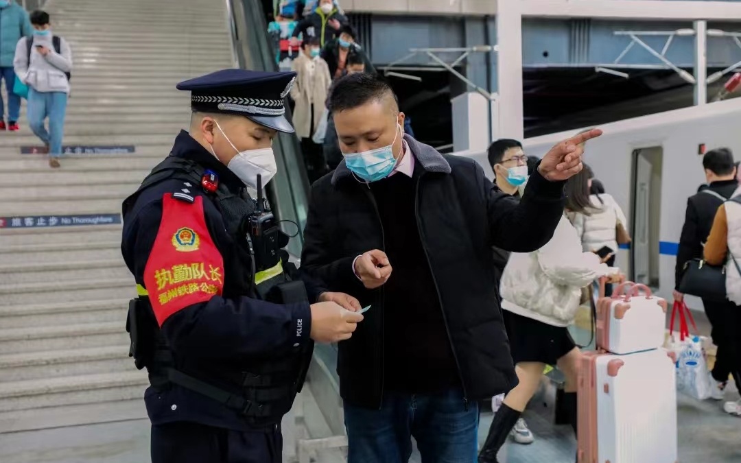2014年,杨仁德在福州站站台帮旅客查找车厢座位 。南昌铁路公安局福州公安处供图