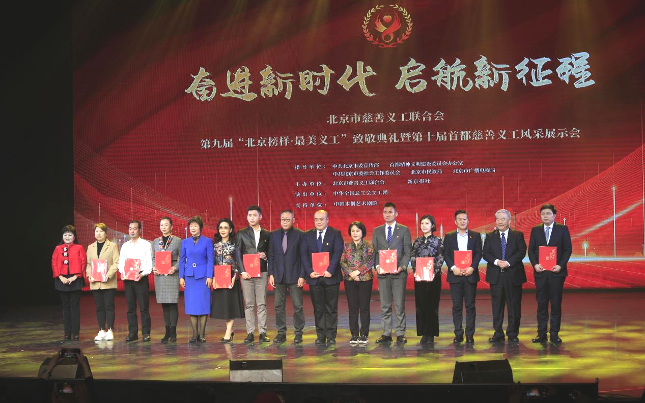 第九届“北京榜样·最美义工”致敬典礼现场,右三为丁全宇。新京报记者 李木易 摄