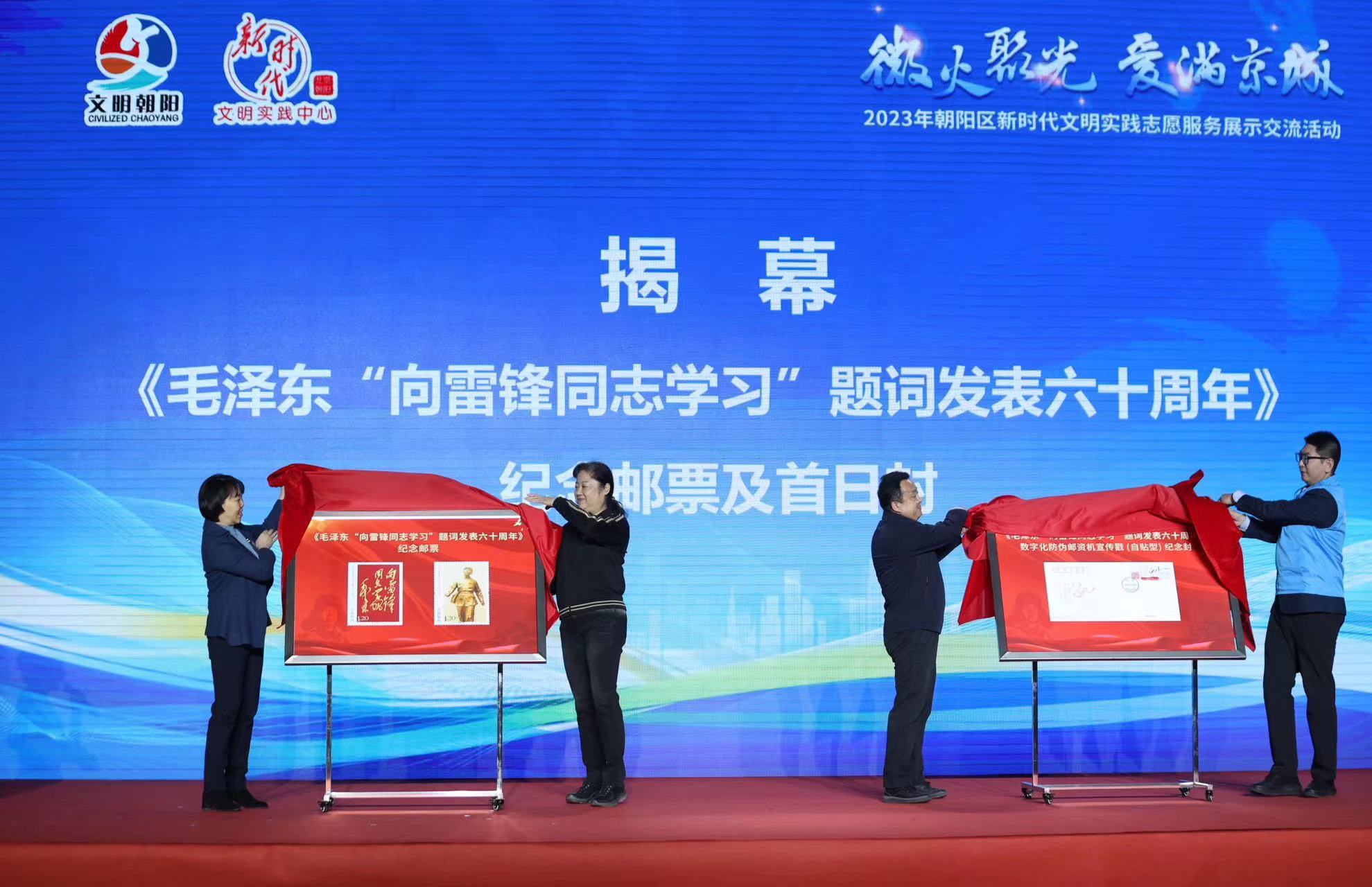 活动上,朝阳区为全区2022年志愿服务“五个10”先进典型颁发荣誉证书。榜样模范、志愿队伍与新时代文明实践所进行结对,揭幕了《毛泽东“向雷锋同志学习”题词发表六十周年》纪念邮票。同时,志愿者代表发起了“践行雷锋精神 朝阳群众在行动”倡议。