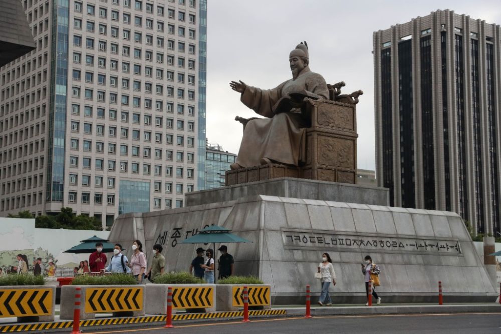 2021年7月8日,行人佩戴口罩走在韩国首尔光化门广场上。(新华社记者王婧嫱摄)