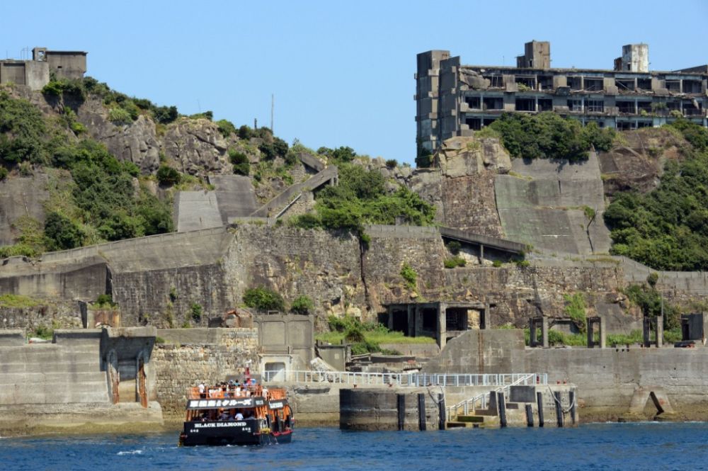 2015年8月8日,在日本长崎“军舰岛”,游船准备靠岸。2015年,日本将包括“军舰岛”在内的23处工业遗址打包为“明治工业革命遗址”申报世界文化遗产。韩国方面对此指出,这些遗址中包含7处日本强征朝鲜半岛劳工的设施,近6万朝鲜半岛劳工二战期间被迫在这些厂矿内从事非人劳作,不少人甚至被虐致死,韩方反对日本此项申遗计划。(新华社记者马平摄)