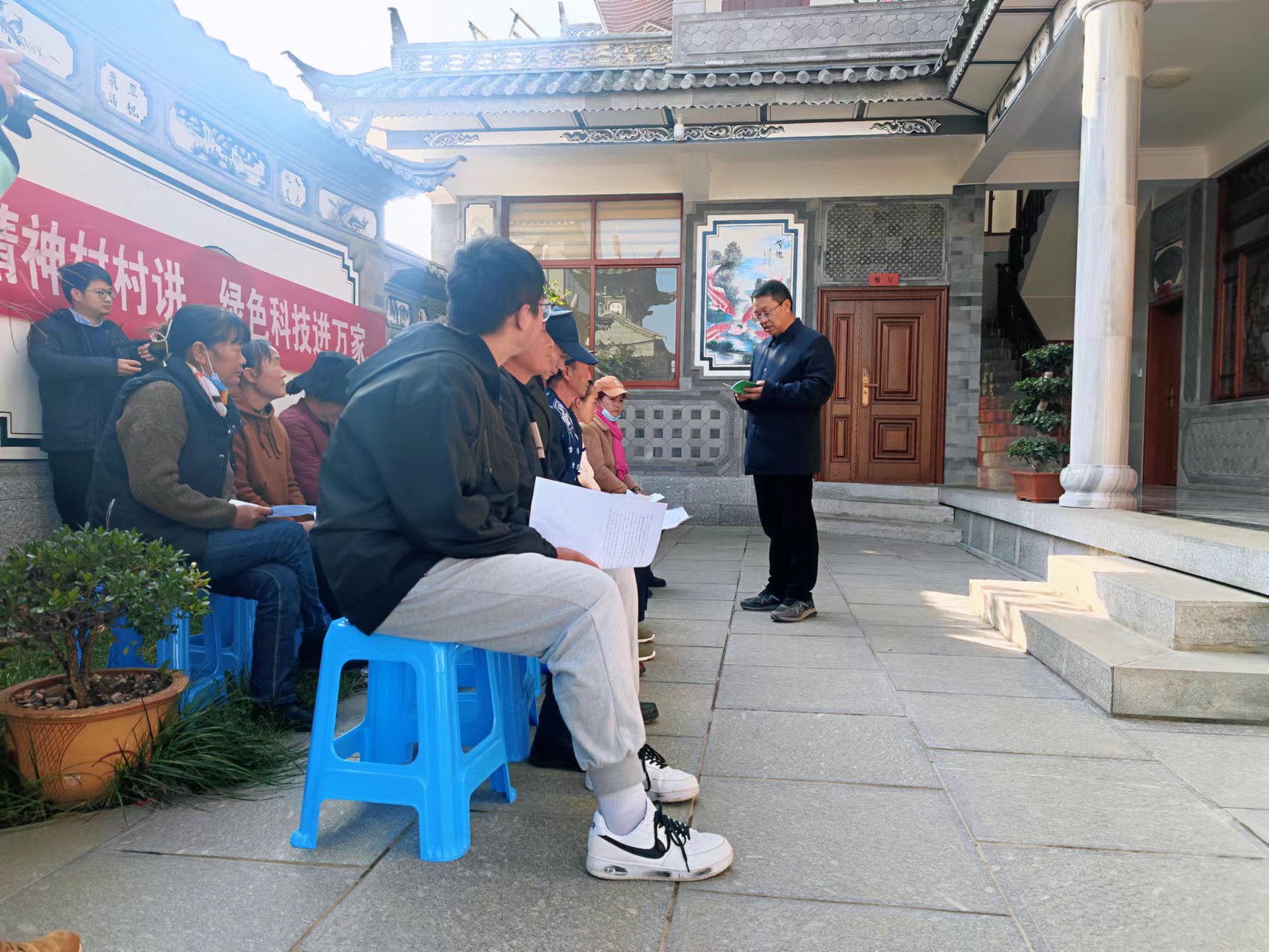 2022年,在云南古生村科技小院,张福锁院士(右)为村民讲述绿色生产和生活方式。受访者供图