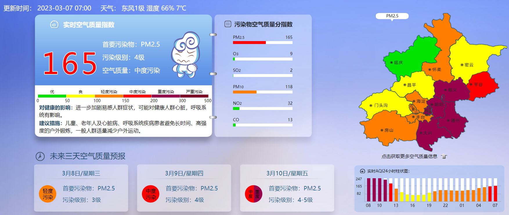 据北京市生态环境监测中心今早7时数据,目前实时空气质量指数165,污染级别4级,空气质量为中度污染。