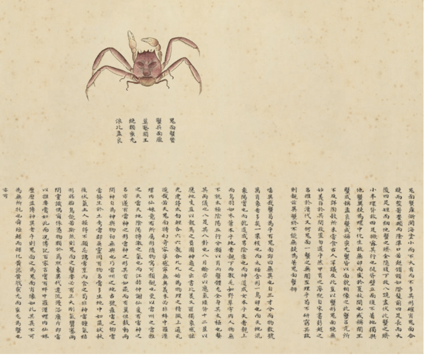 如此奇蟹,必然史不绝书吧?可聂璜惊讶地发现“古人罕议及此”。他在鬼面蟹的画像旁愤愤不平地絮叨:难道大家觉得蟹上长出鬼脸毫无意义,所以都不讨论吗?可是谁敢说鬼面的螃蟹无关至理呢?如果不研究清楚原因,人们看到此蟹必定会疑惑,所以我要为它写一篇《鬼面蟹辨》!