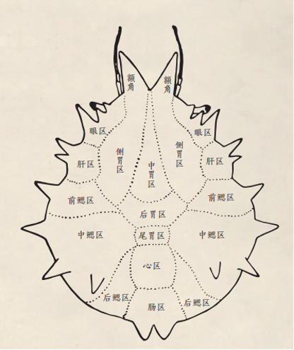 此外,在蟹类学家看来,这鬼脸实在没什么可奇怪的,因为他们见的蟹太多了。关公蟹的背壳花纹,其实和其他螃蟹的很相似。所有螃蟹的壳都有一些高低不平的隆块,位置和内脏对应。蟹类学家据此把蟹壳分成额区、眼区、胃区、心区、肠区、肝区和鳃区等区域。对照这几个区域的模式图你会发现,关公蟹鬼脸的“眼睛”就是前鳃区,“脸蛋”就是中后鳃区,“鼻子”就是心区和肠区,眉心的那道褶皱叫颈沟,是头部和胸部愈合后残留的分界线。很多螃蟹都有这些结构,只不过关公蟹更明显罢了。所以,问蟹类学家“为什么关公蟹后背像鬼脸”,就像问气象学家“为什么那块云朵像绵羊”,问地质学家“为什么那座山的轮廓像佛像”,只能得到这样的回答:“不为什么,它就是恰好像了嘛!”