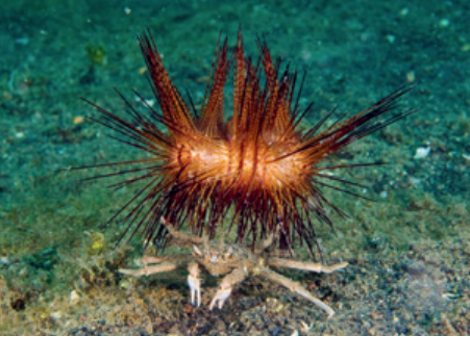 另外,关公蟹有一个特殊习性:背一个东西盖住后背保护自己。它的最后四条腿不是特别小,还翻在背上吗?就是为了背东西而特化的。张旭据此又有一个猜测:鬼面纹有没有可能是为了增大摩擦力,让背上的东西不致脱落?这一点我倒不太认可。我在厦门见过很多活体关公蟹,它们喜欢用四条小腿背着一种特殊的海葵——伸展蟹海葵。这种海葵已经和关公蟹形成了一定的共生关系,能分泌几丁质膜,吸附在关公蟹背上。若遇到章鱼之类的天敌,关公蟹还会用四条小腿举起海葵,把它有毒的触手按在天敌身上,主动蜇走天敌。如果说鬼面纹是为了利于伸展蟹海葵的附着,还有些可能。但关公蟹除了海葵,还会背很多杂物,比如贝壳、树叶、海胆,它们和蟹背无法紧密贴合,主要是靠蟹的四条小腿抓着,鬼面纹也就起不到增大摩擦力的作用了。对了,鬼面纹也可能不是为了恐吓天敌,因为纹路平时都被背负物挡住了,天敌根本看不见。