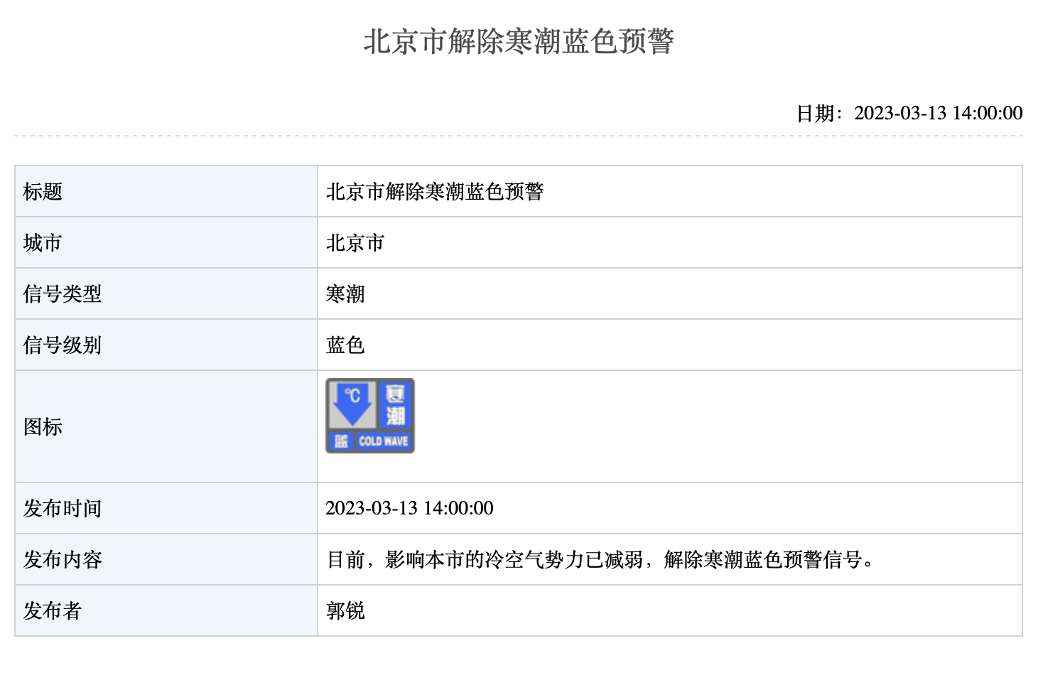 新京报讯 据北京市气象局网站消息,目前,影响本市的冷空气势力已减弱,解除寒潮蓝色预警信号。