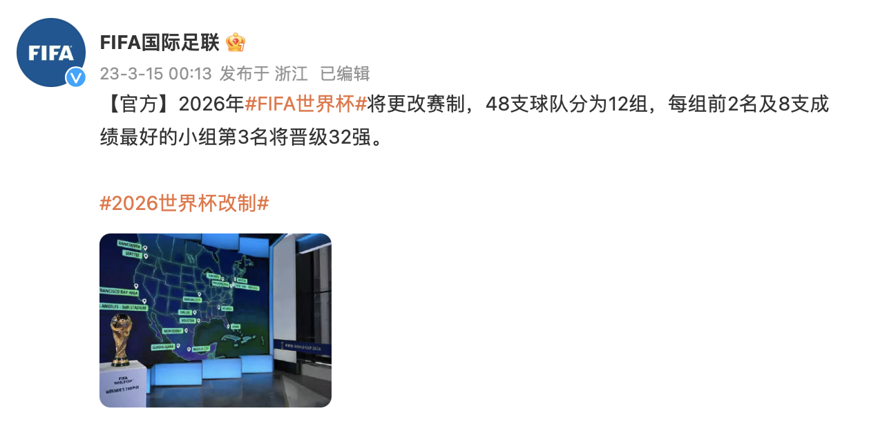 新京报讯 据@FIFA国际足联 消息,2026年FIFA世界杯将更改赛制,48支球队分为12组,每组前2名及8支成绩最好的小组第3名将晋级32强。