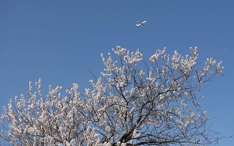 飞机从蓝天掠过,枝头桃花正在绽放。