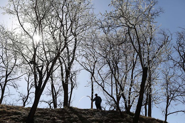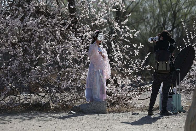 3月15日,圆明园里桃粉、柳绿、碧波荡漾,一片春意盎然的景色,公园迎来最佳踏春时节。图为古装爱好者在盛开的桃花旁留影。