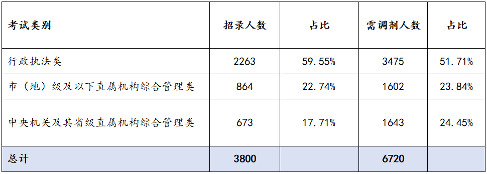 据统计,2023国考三类试卷均有调剂需求,副省及以上机关调剂数量较少。行政执法类调剂需求量最大,需调剂3475人,占总调剂人数的51.71%。市(地)级及以下直属机构综合管理类需调剂1602人,占总调剂人数的23.84%。