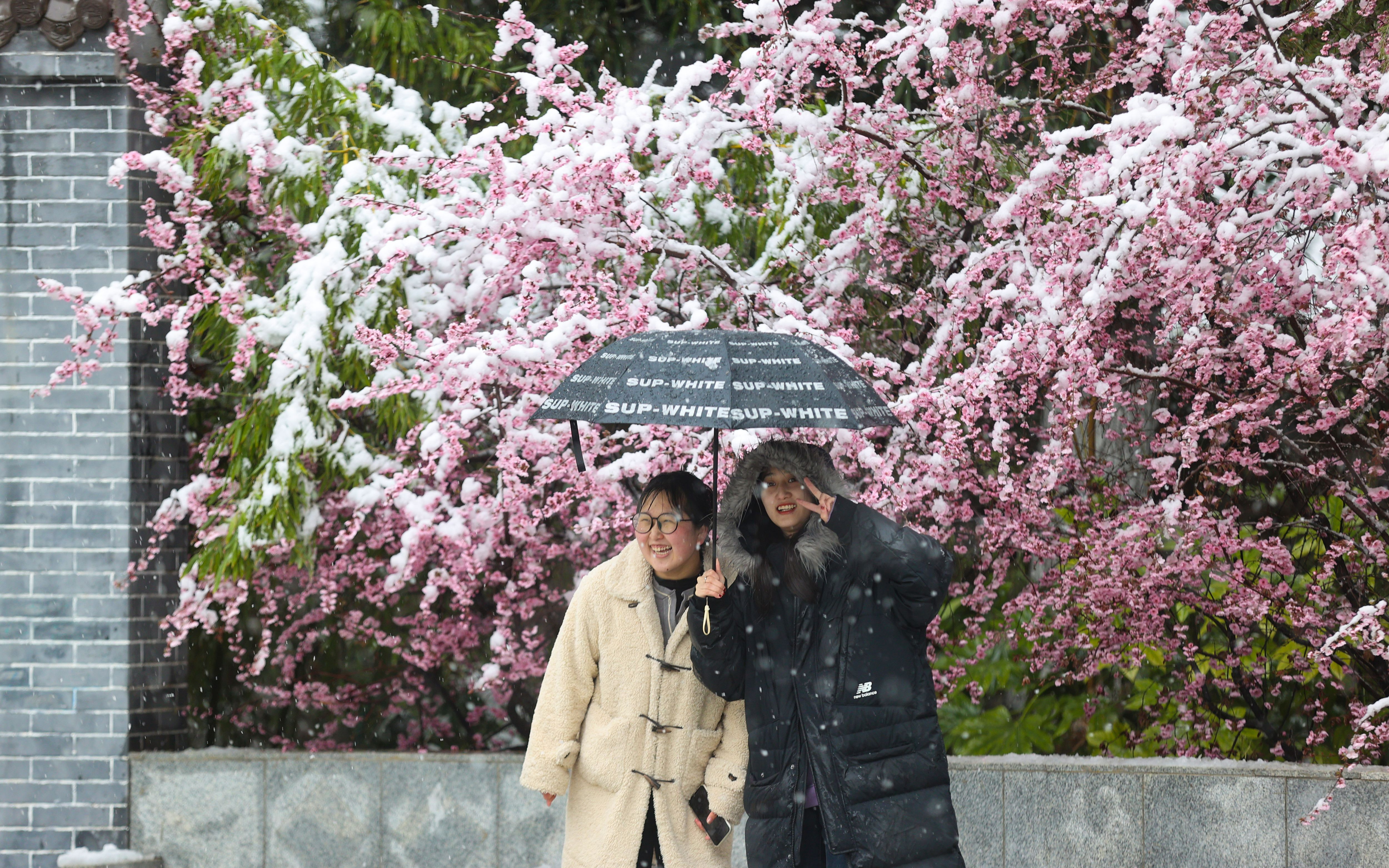 3月16日,河南三门峡,当地气温“大跳水”,下起了“桃花雪”,市民正在雪中拍照。图/视觉中国